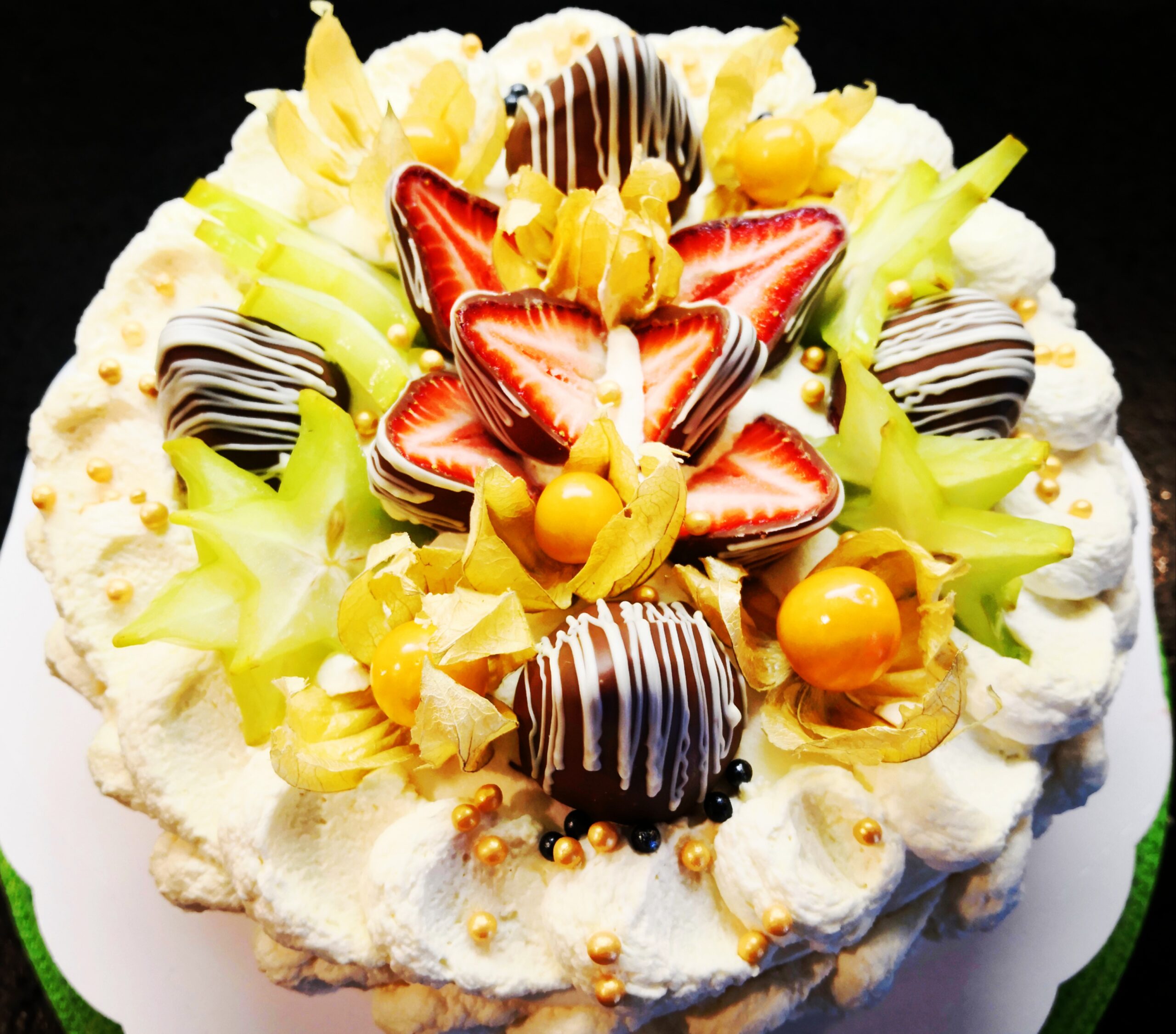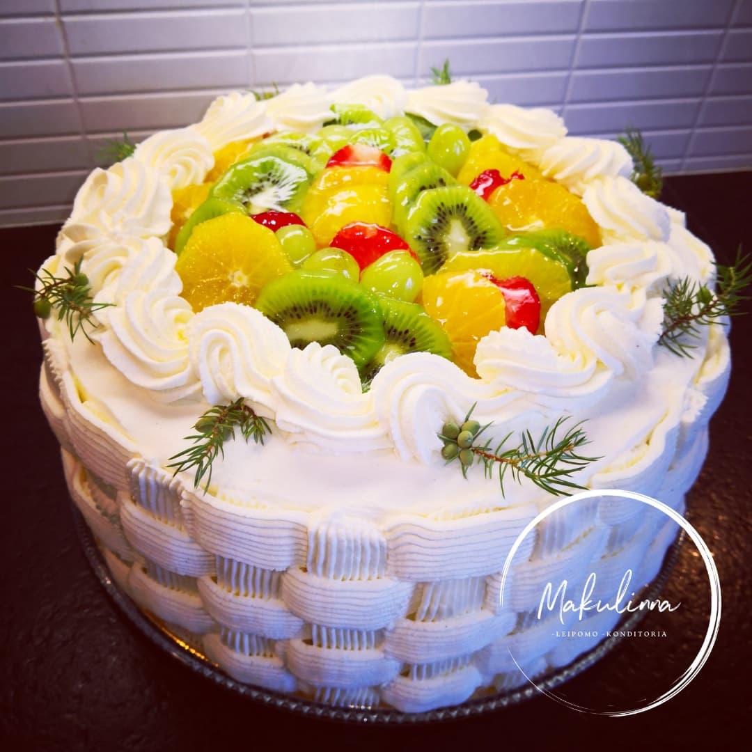Raikas ja maukas kakku, jonka välissä on Makulinnan itsetehtyä omena-kanelihilloa ja lisänä tuoretta päärynää. Koristelen sen erilaisilla hedelmillä satokauden mukaan ja tuote on laktoositon. Kakkuni ovat tavanomaista korkeampia, sillä laitan täytettä kolmeen kerrokseen. Pohja on rakenteeltaan pehmeä ja kuohkea. Levykakku on myös mahdollinen. Gluteeniton alk. + 5 € kakku.