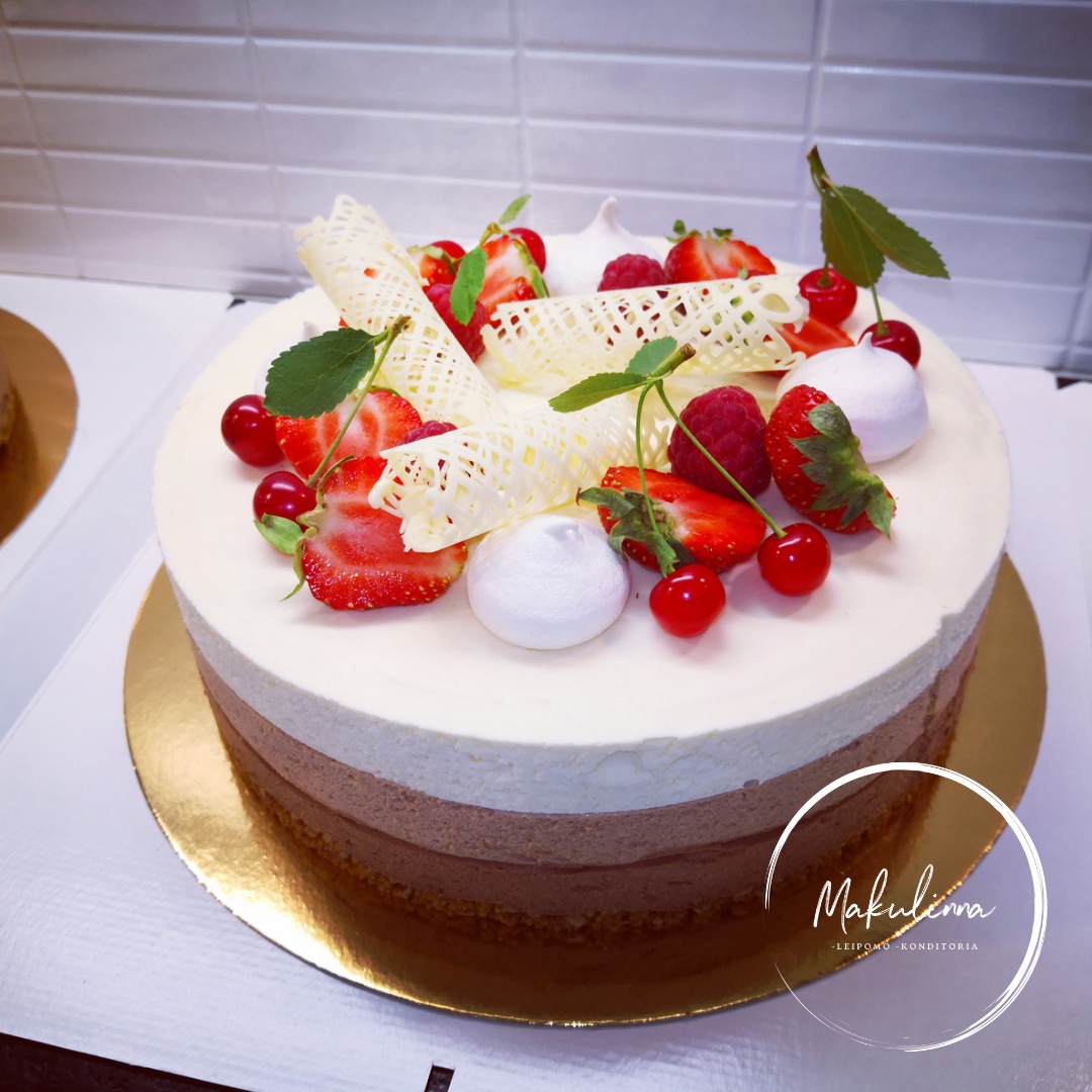 Tässä kakussa yhdistyvät täydellisesti valko,- maito- ja tumma suklaa. Herkullinen ja suussa sulava kolmen suklaan juustokakku on suosituimpia juustokakkuja. Lisäksi tämä suklaaunelma sopii juhlaan kuin juhlaan. Koristelu voi vaihdella vuodenaikojen mukaan. Gluteeniton alk. + 5 € kakku.